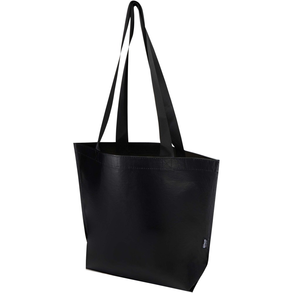 Duplán laminált aljú bevásárlótáska 150 g/m2 súlyú, GRS tanúsítvánnyal rendelkező, újrahasznosított RPET anyagból készül. A dupla laminálásnak köszönhetően a táska fokozott tartóssággal és vízlepergető tulajdonságokkal rendelkezik, így megbízható megoldást nyújt a mindennapi használat során. A termék tágas, nyitott főrekesszel, megerősített hordfülekkel és extra kapacitást biztosító széles alsó résszel rendelkezik. A 18 literes űrtartalmú táska teherbírása 10 kg, így esztétikus és praktikus választás bevásárláshoz, szakvásárokra vagy reprezentatív céges eseményekre. Az újrahasznosított alapanyag révén kiválóan alkalmas öko-szemléletű emblémázott ajándéknak.