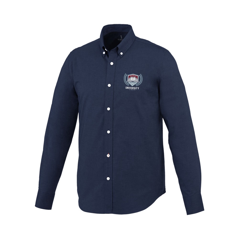 Normál szabásvonal. Elevate logóval gravírozott, fehér gombok. Alulról a második gomblyuk narancssárga öltésekkel dekorálva. Két gombos, állítható kézelő gombolás. Tónusos logónyomat hátul. Szatén szegély a nyakvonalban. Legombolható gallér (férfi). 100% pamut Oxford anyag.