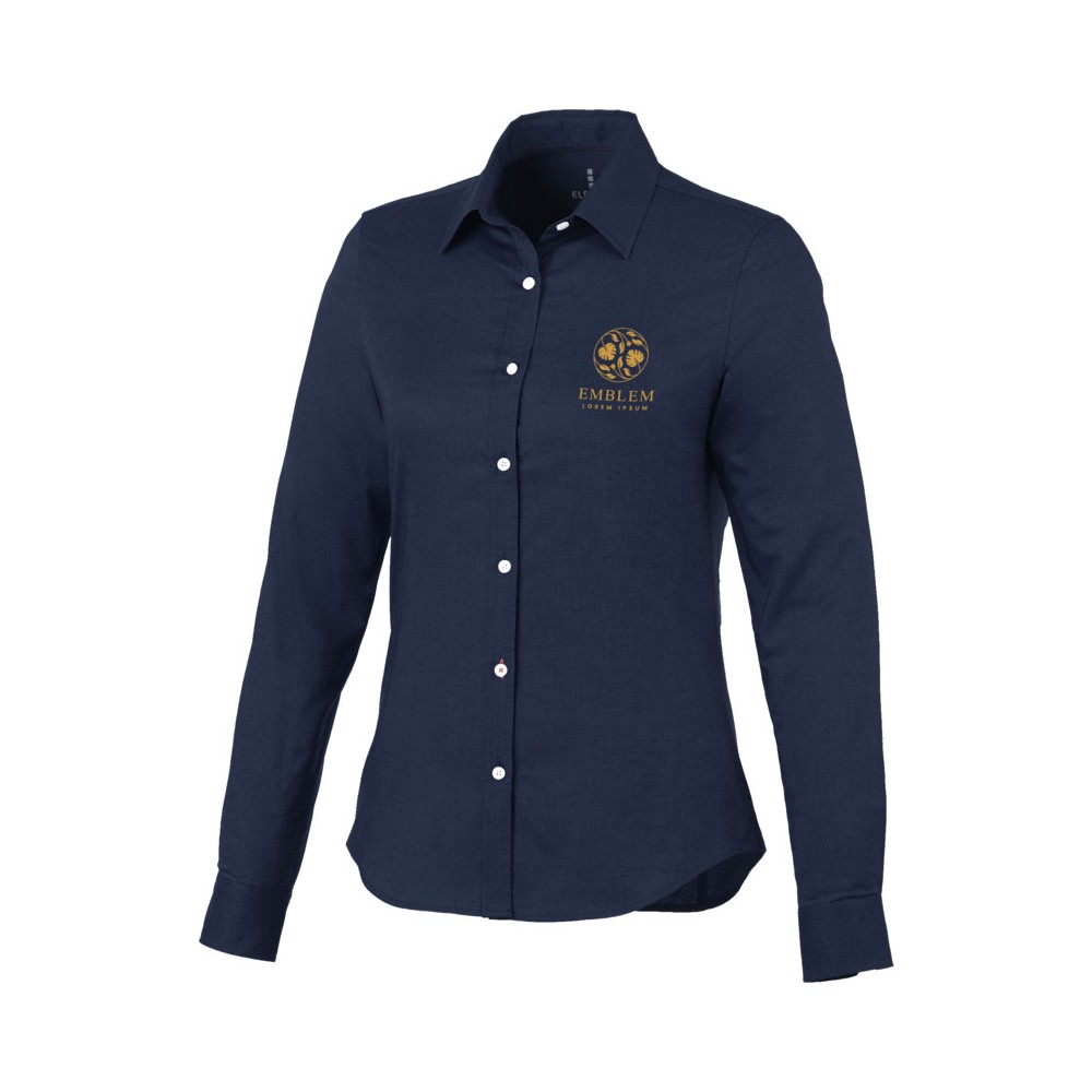 Normál szabásvonal. Elevate logóval gravírozott, fehér gombok. Alulról a második gomblyuk narancssárga öltésekkel dekorálva. Két gombos, állítható kézelő gombolás. Tónusos logónyomat hátul. Szatén szegély a nyakvonalban. Legombolható gallér (férfi). 100% pamut Oxford anyag.