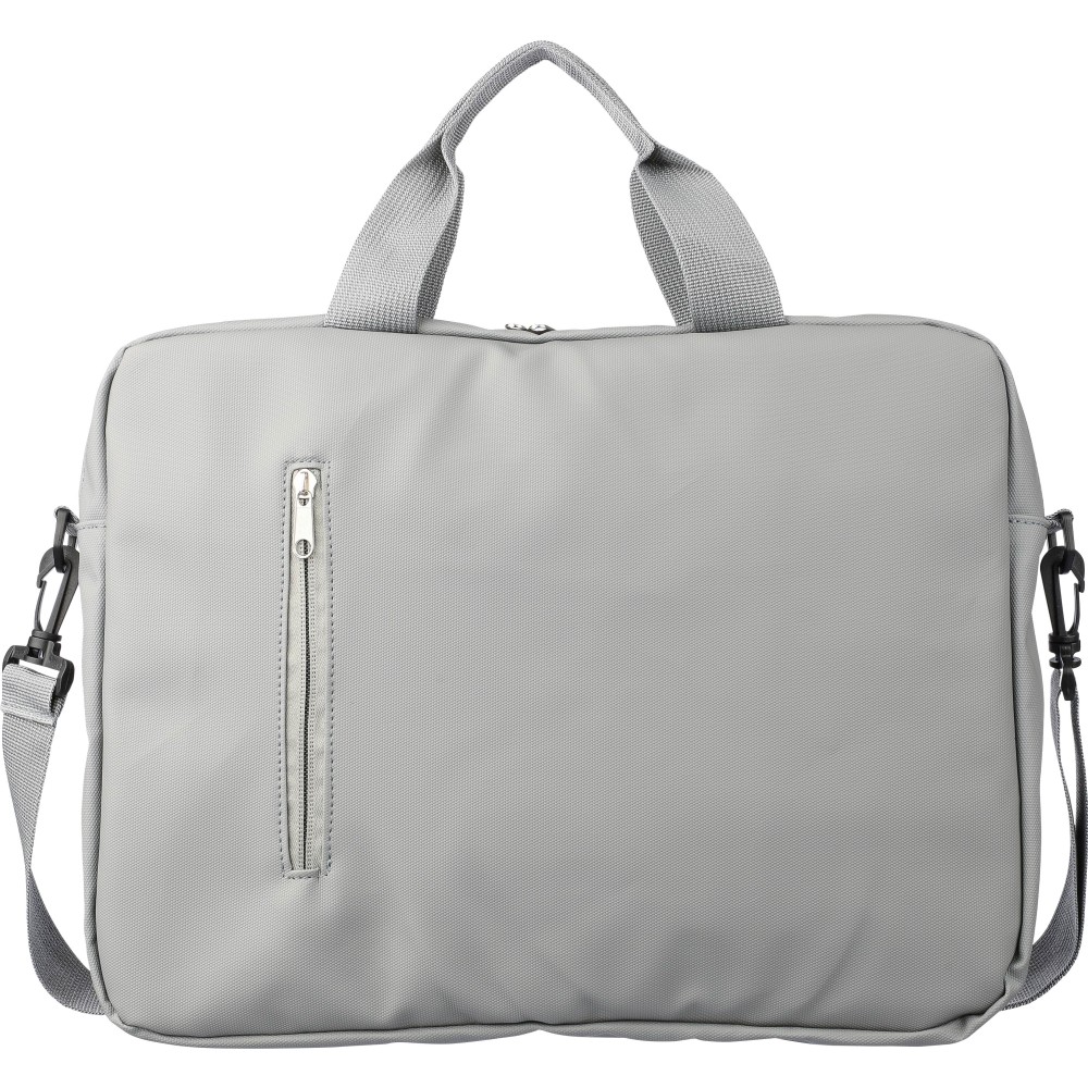 Laptoptáska 15"-es laptophoz PU anyagból, két cipzáras első zsebbel, egy nagy cipzáras rekesszel és tépőzáras laptop résszel, valamint több belső zsebbel. Állítható vállpántokkal és két fogantyúval rendelkezik. Vízlepergető. Anyaga: PU.