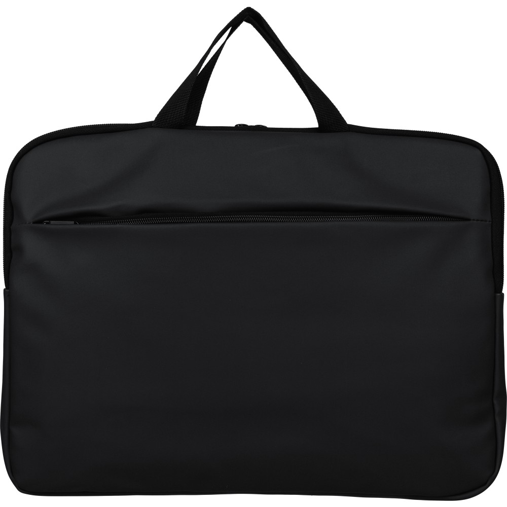 Újrahasznosított PU anyagból készült laptoptáska legfeljebb 15 hüvelykes készülékekhez, 4 mm vastag párnázással és 210D újrahasznosított béléssel. Elülső cipzáras zsebbel, hátoldali tépőzáras zsebbel, két rövid fogantyúval és állítható vállpánttal rendelkezik. A belső címkén újrahasznosított alapanyagra utaló logó található.