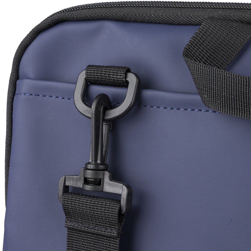 Újrahasznosított PU anyagból készült laptoptáska legfeljebb 15 hüvelykes készülékekhez, 4 mm vastag párnázással és 210D újrahasznosított béléssel. Elülső cipzáras zsebbel, hátoldali tépőzáras zsebbel, két rövid fogantyúval és állítható vállpánttal rendelkezik. A belső címkén újrahasznosított alapanyagra utaló logó található.
