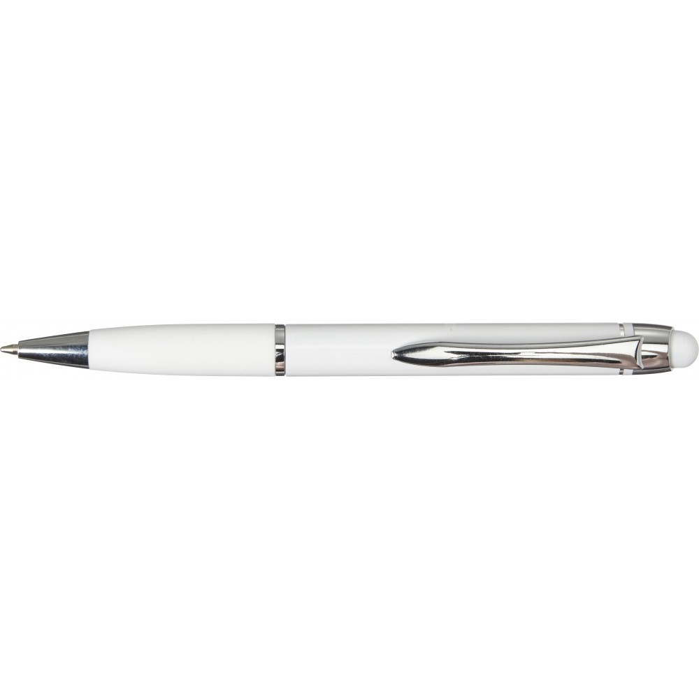 Golyóstoll érintővel, fényes felülettel, színben illeszkedő gumis fogórésszel, fényes ezüst kiegészítőkkel, fekete tollbetéttel. Alumínium.