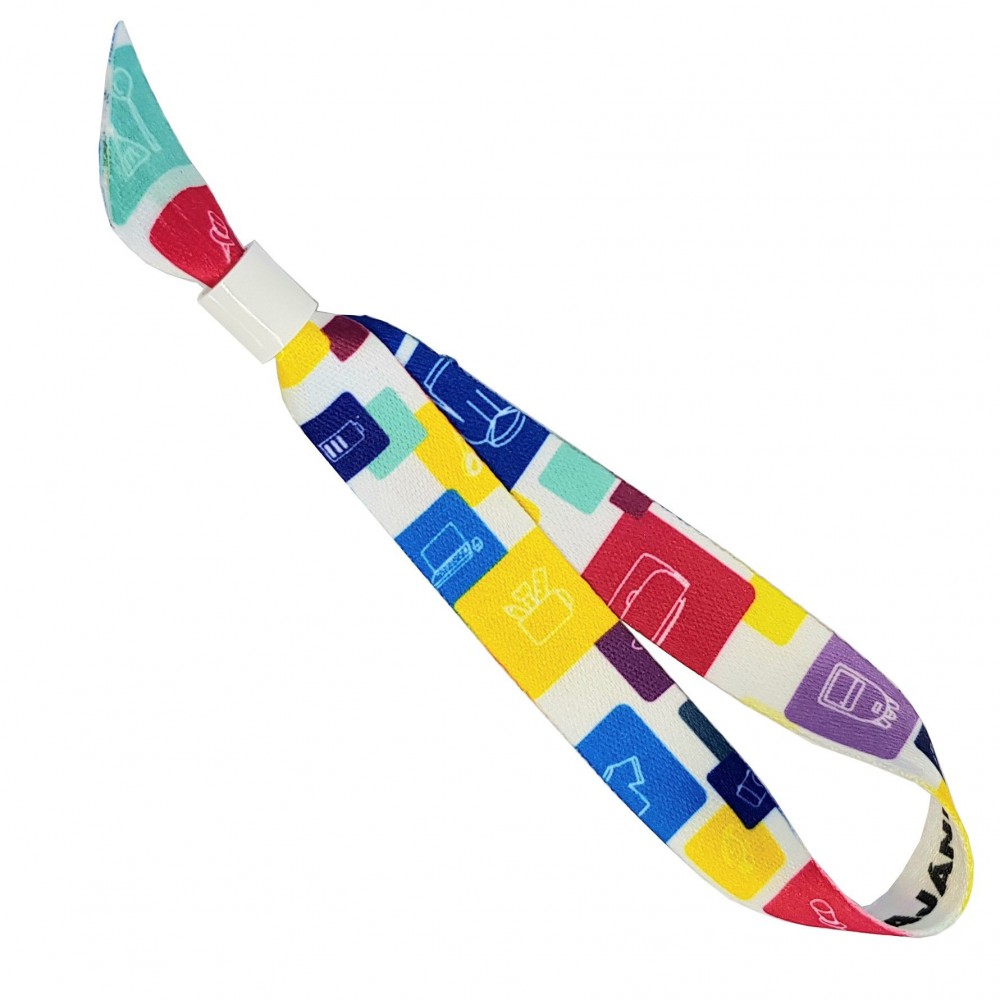Teljes felületen szublimációs eljárással nyomható 15 mm széles karpánt konferenciára, fesztiválra. Nem csak a biztonságos beléptetést szolgálja, hanem emlékként is elrakják az emberek. Csak dekorálva rendelhető.