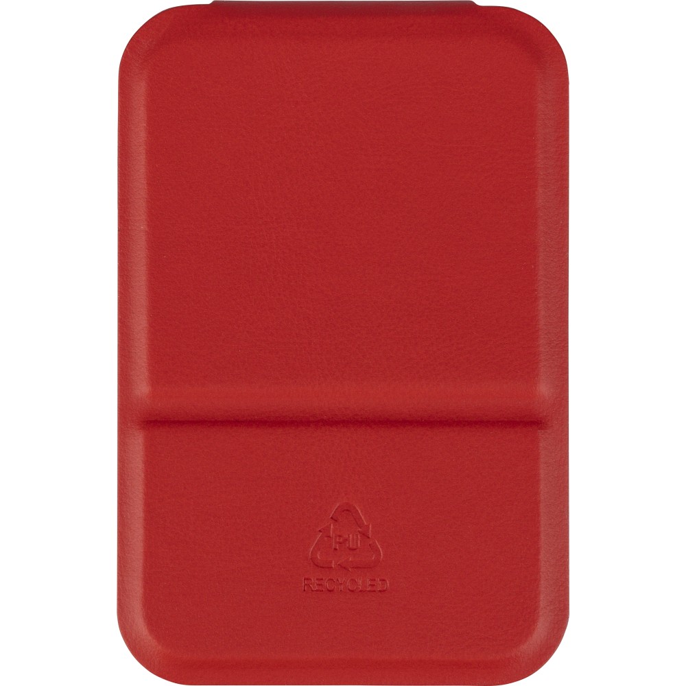 Üvegtükör összehajtható, újrahasznosított PU borítással, amely kinyitva álló helyzetben használható. A borításon dombornyomott, újrahasznosított alapanyagra utaló logó található. Papírtasakba csomagolva.