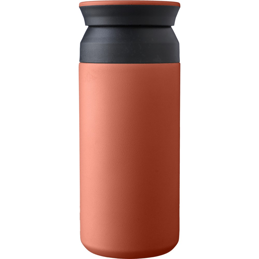 Duplafalú vákuumos bögre lapos PP fedéllel. Matt lakkozott. A belső rész 304-es rozsdamentes acélból, a külső rész 201-es rozsdamentes acélból készült. Könnyen nyitható PP mechanizmussal. A tartalmát 12 órán át melegen és 18 órán át hidegen tartja. Egyenként barna karton ajándékdobozba csomagolva. Űrtartalom: 350 ml.