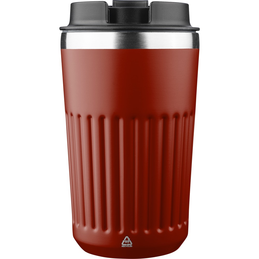 Újrahasznosított rozsdamentes acélból készült utazópohár 400 ml űrtartalommal, duplafalú kialakítással és külső bordázott felülettel. Belső része 304-es, külső része 201-es rozsdamentes acél, PP fedéllel. A pohártesten gravírozott recycled (újrahasznosított) alapanyagra utaló logó található. Darabonként barna kartondobozba csomagolva.