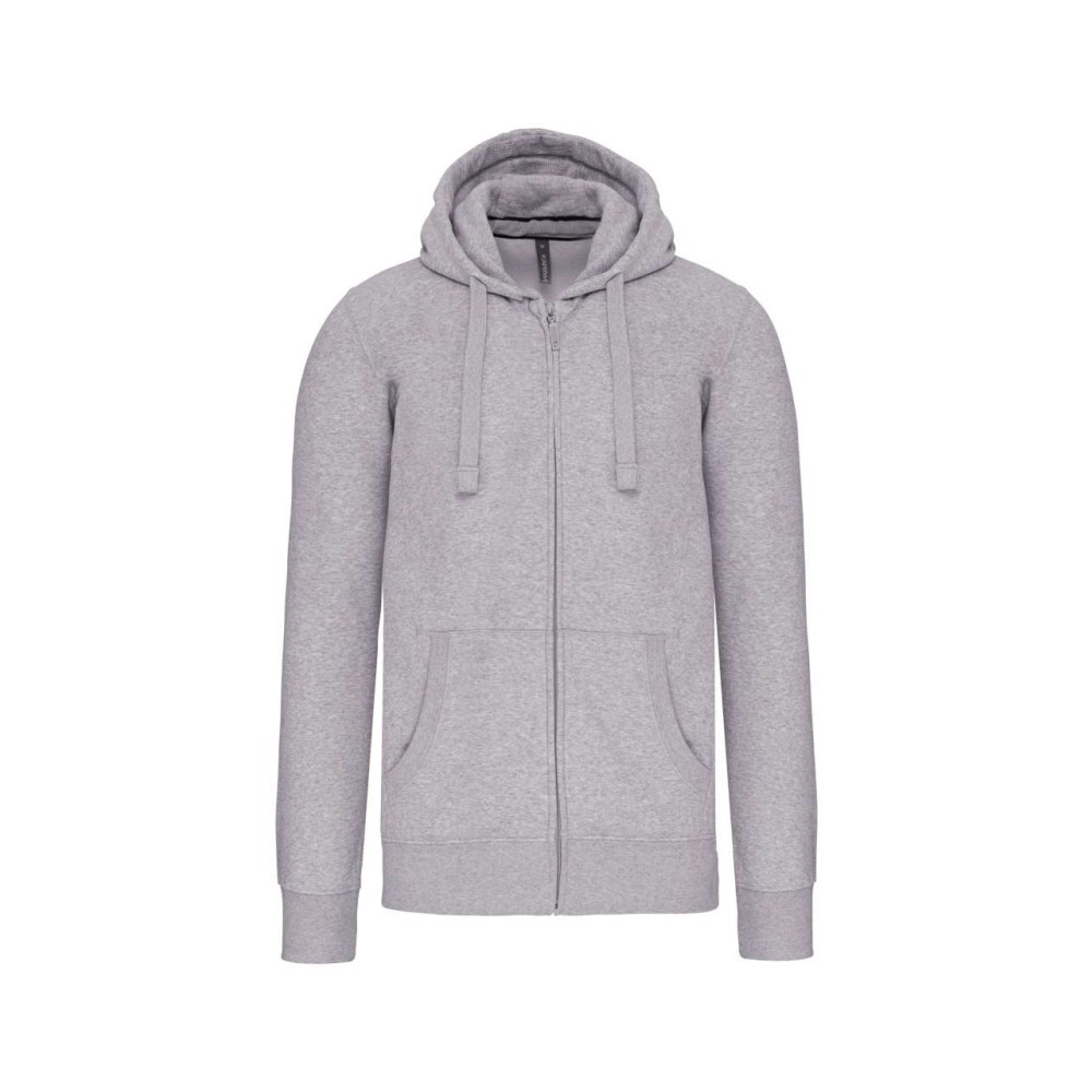 80% pamut és 20% poliészter. Belül bolyhos anyag, szürke színű szalagerősítés a nyakban, bélelt kapucni, kenguruzseb, bordás ujj- és derékpasszé, YKK cipzár. 300 g/m2.
