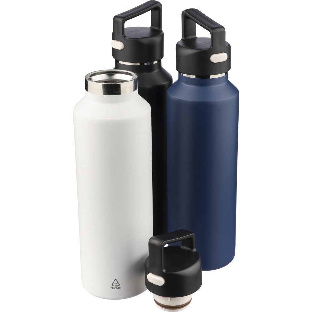 Újrahasznosított rozsdamentes acélból készült, vákuumszigetelésű palack 600 ml űrtartalommal, duplafalú kialakítással, hordozófüllel ellátott PP fedéllel és kétféle (dupla) nyitási lehetőséget biztosító nyomógombos rendszerrel. A palacktesten lézergravírozott recycled (újrahasznosított) alapanyagra utaló logó található. Darabonként barna kartondobozba csomagolva.