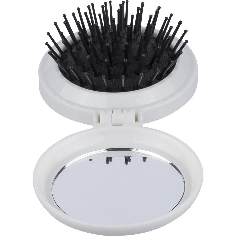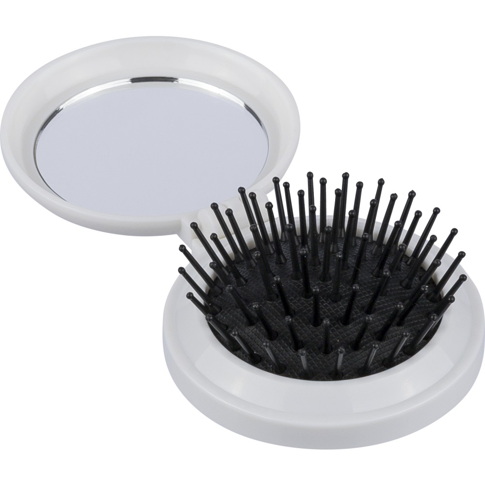 Újrahasznosított ABS-ből hajkefe és tükör, praktikus kialakítású útközbeni használatra, a terméken újrahasznosított alapanyagra utaló megjelölés található.